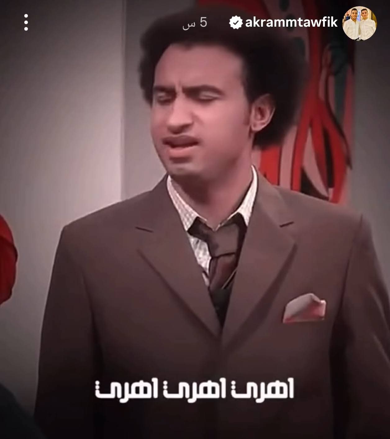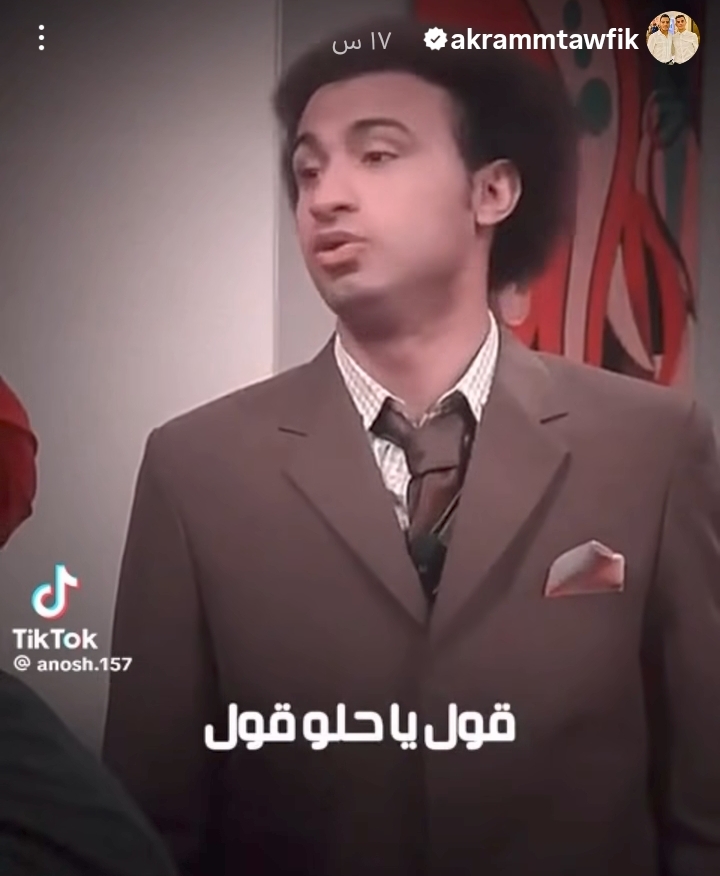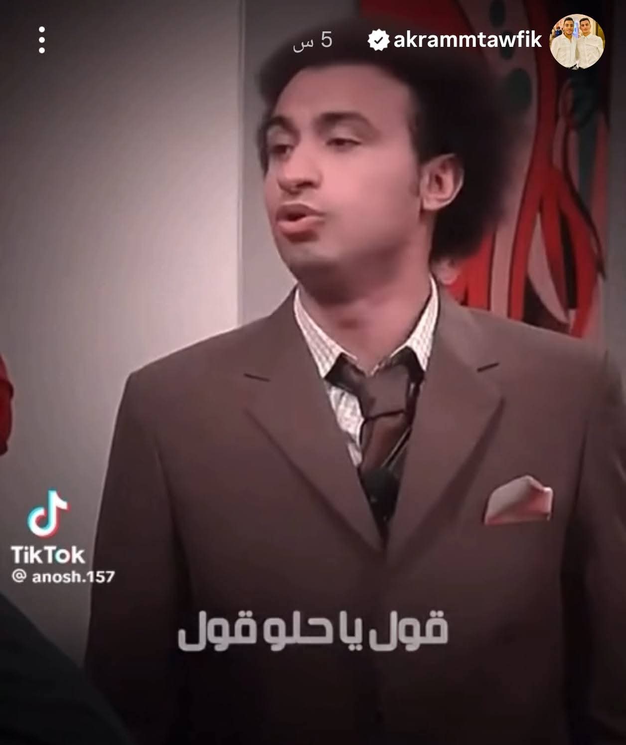 ونشر أكرم توفيق عبر "استوري" حسابه الرسمي على موقع التواصل الاجتماعي "إنستجرام" مقطع فيديو من إحدى مسرحيات الفنان علي ربيع، وهو يردد: "قول يا حلو قول، قول زي ما تقول، اهري اهري اهري".