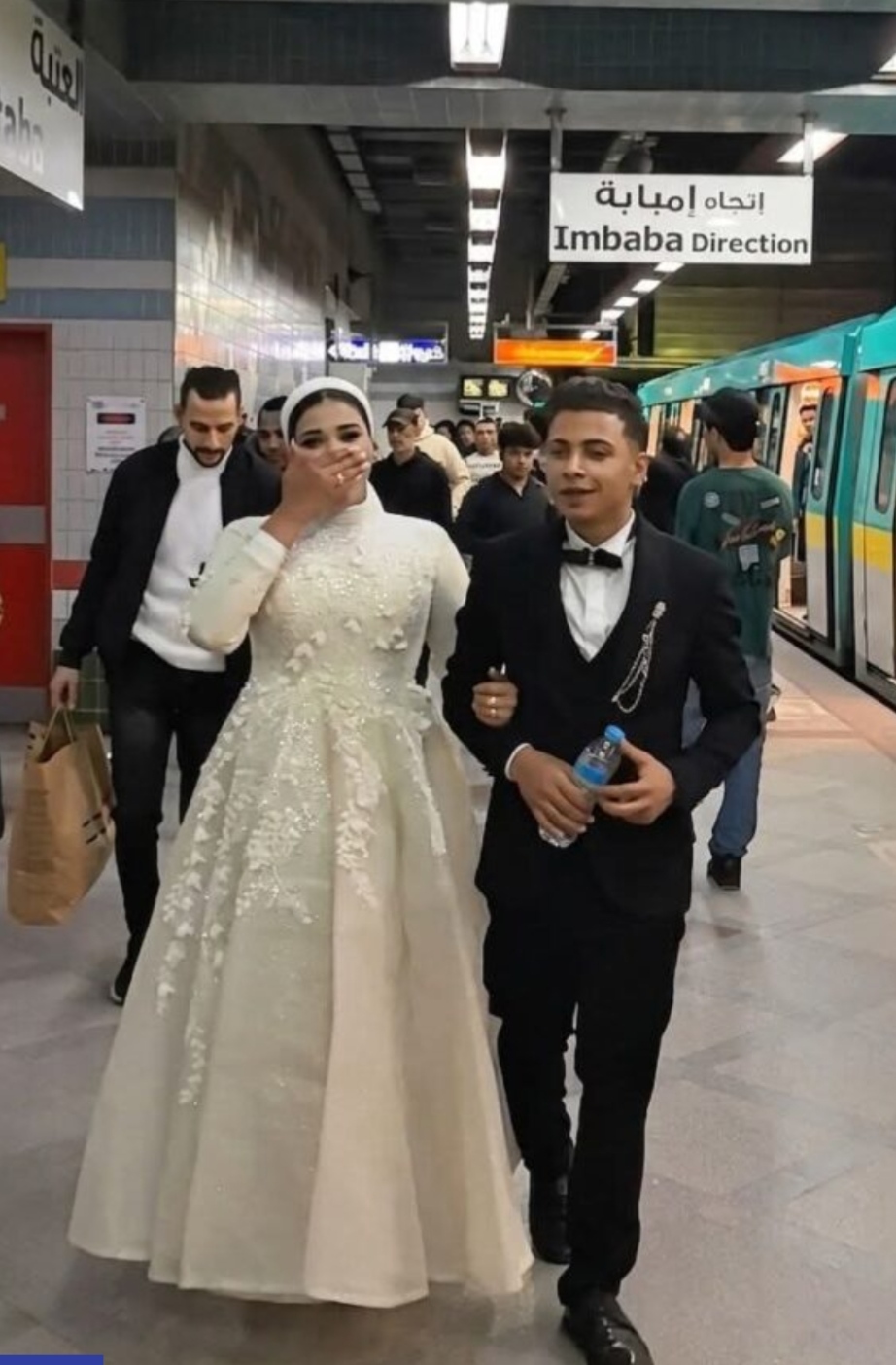 وظهر العريس والعروس داخل محطة مترو الأنفاق باتجاه محطة أمبابة بمفردهم دون أصدقائهم، وأطلقت بعض السيدات الزغاريد، احتفالًا بالعروسين.