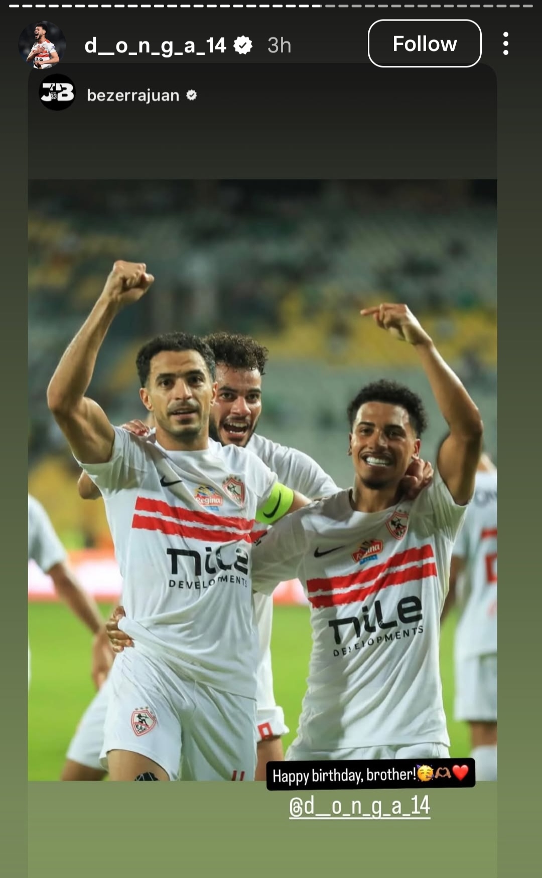 وحرص نجم الزمالك خوان بيزيرا علي تهنئة نبيل عماد دونجا بعيد ميلادة بمشاركه صورة برفقته و علق كاتبا:عيد ميلاد سعيد أخويا.