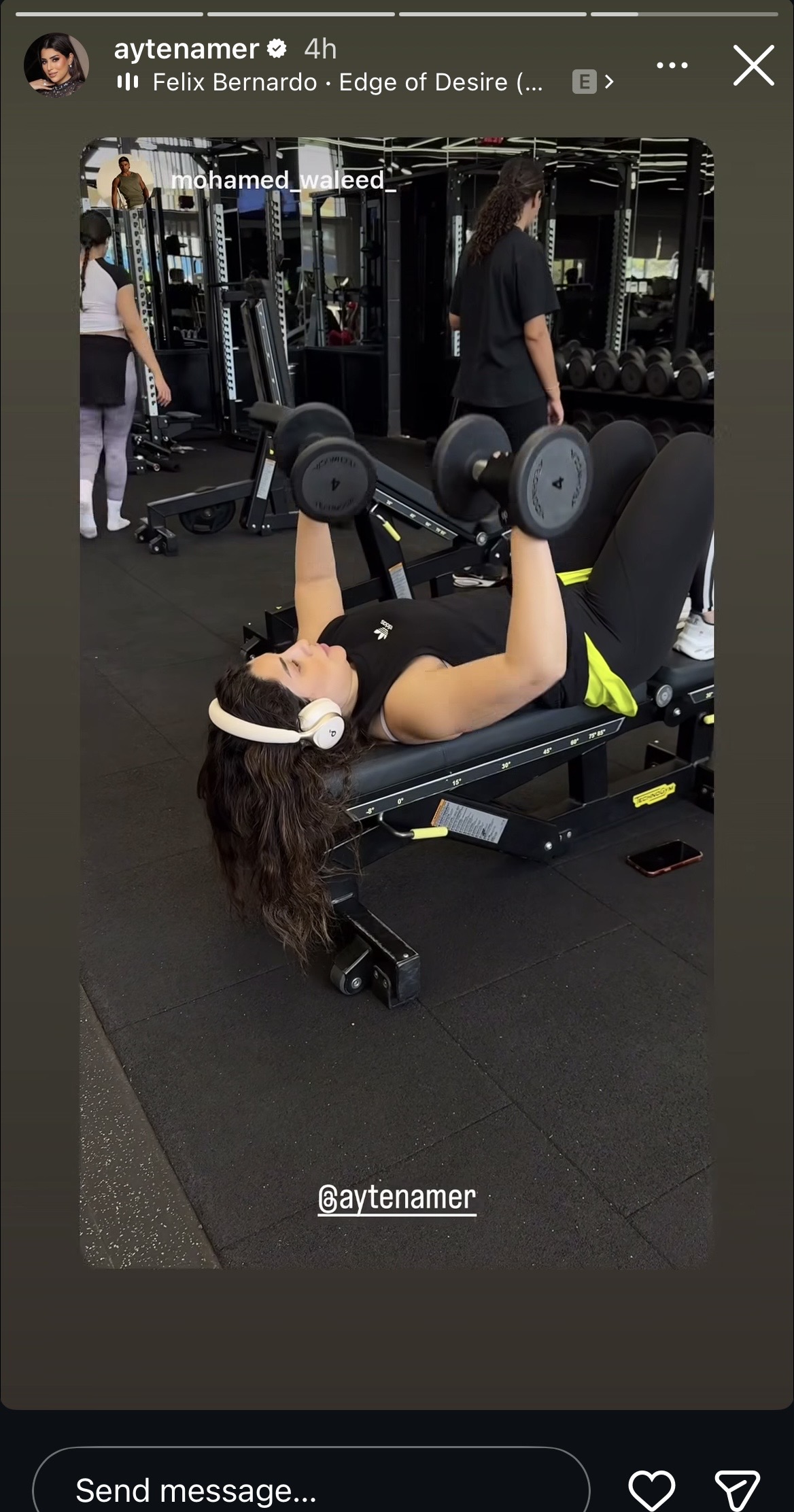 وظهرت آيتن عامر أثناء ممارسة تمارين رياضية قوية من الجيم، وتفاعل معها عدد كبير من جمهورها.