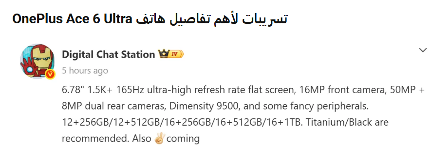 تسريب المواصفات الرئيسية لهاتف OnePlus Ace 6 Ultra