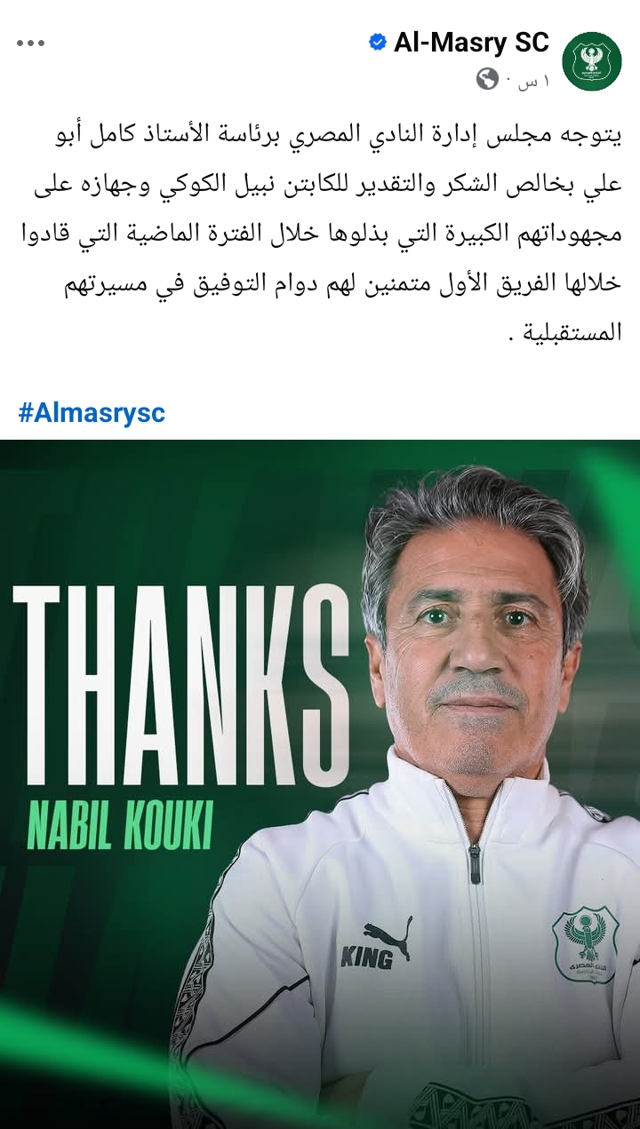 وكتب النادي المصري عبر صفحته الرسمية بموقع التواصل الاجتماعي “فيس بوك”:"يتوجه مجلس إدارة النادي المصري برئاسة كامل أبو علي بخالص الشكر والتقدير للكابتن نبيل الكوكي وجهازه على مجهوداتهم الكبيرة التي بذلوها خلال الفترة الماضية التي قادوا خلالها الفريق الأول متمنين لهم دوام التوفيق في مسيرتهم المستقبلية".