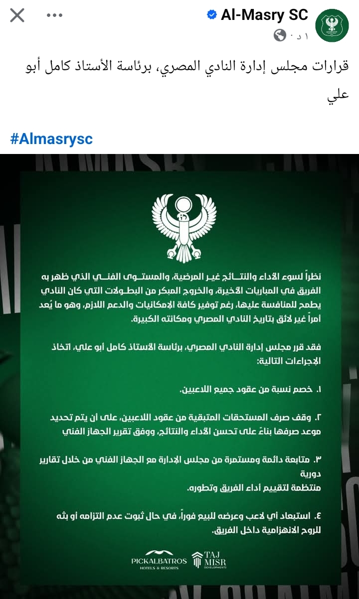 فقد قرر مجلس إدارة النادي المصري، برئاسة كامل أبو علي، اتخاذ الإجراءات التالية: