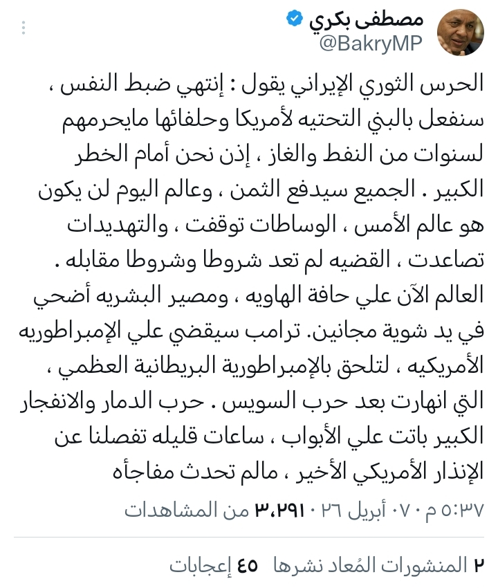 حذر الإعلامي مصطفى بكري من تصاعد التوتر بين الولايات المتحدة وإيران، مشيرًا إلى تصريحات الحرس الثوري الإيراني التي تقول: "انتهى ضبط النفس، وسنفعل بالبني التحتيه لأمريكا وحلفائها ما يحرمهم لسنوات من النفط والغاز".