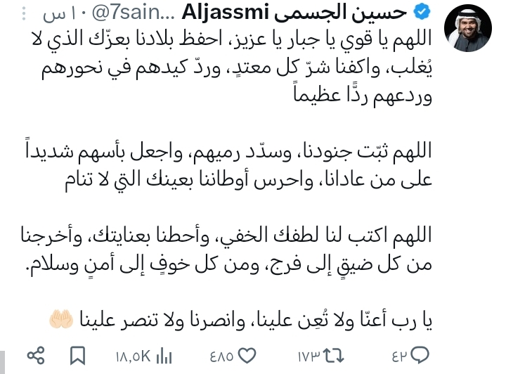 "اللهم يا قوي يا جبار يا عزيز، احفظ بلادنا بعزّك الذي لا يُغلب، واكفنا شرّ كل معتدٍ، وردّ كيدهم في نحورهم وردعهم ردًّا عظيماً"