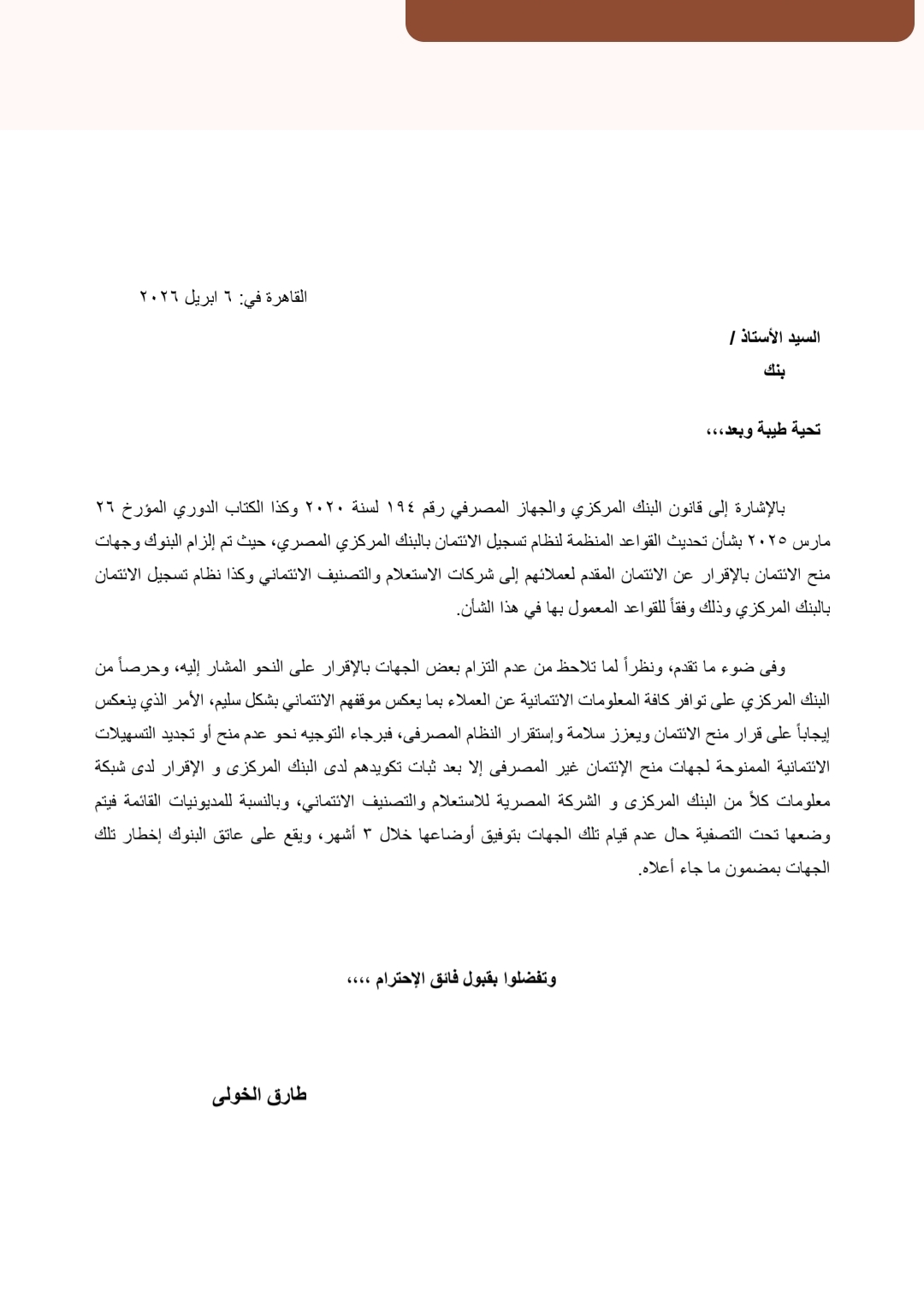 وجه طارق الخولي، نائب محافظ البنك المركزي المصري، رؤساء البنوك بعدم منح أو تجديد التسهيلات الائتمانية الممنوحة لجهات منح الائتمان غير المصرفي إلا بعد ثبات تكويدهم لدى البنك المركزى والإقرار لدى شبكة معلومات كلاً من البنك المركزى و الشركة المصرية للاستعلام والتصنيف الائتماني.