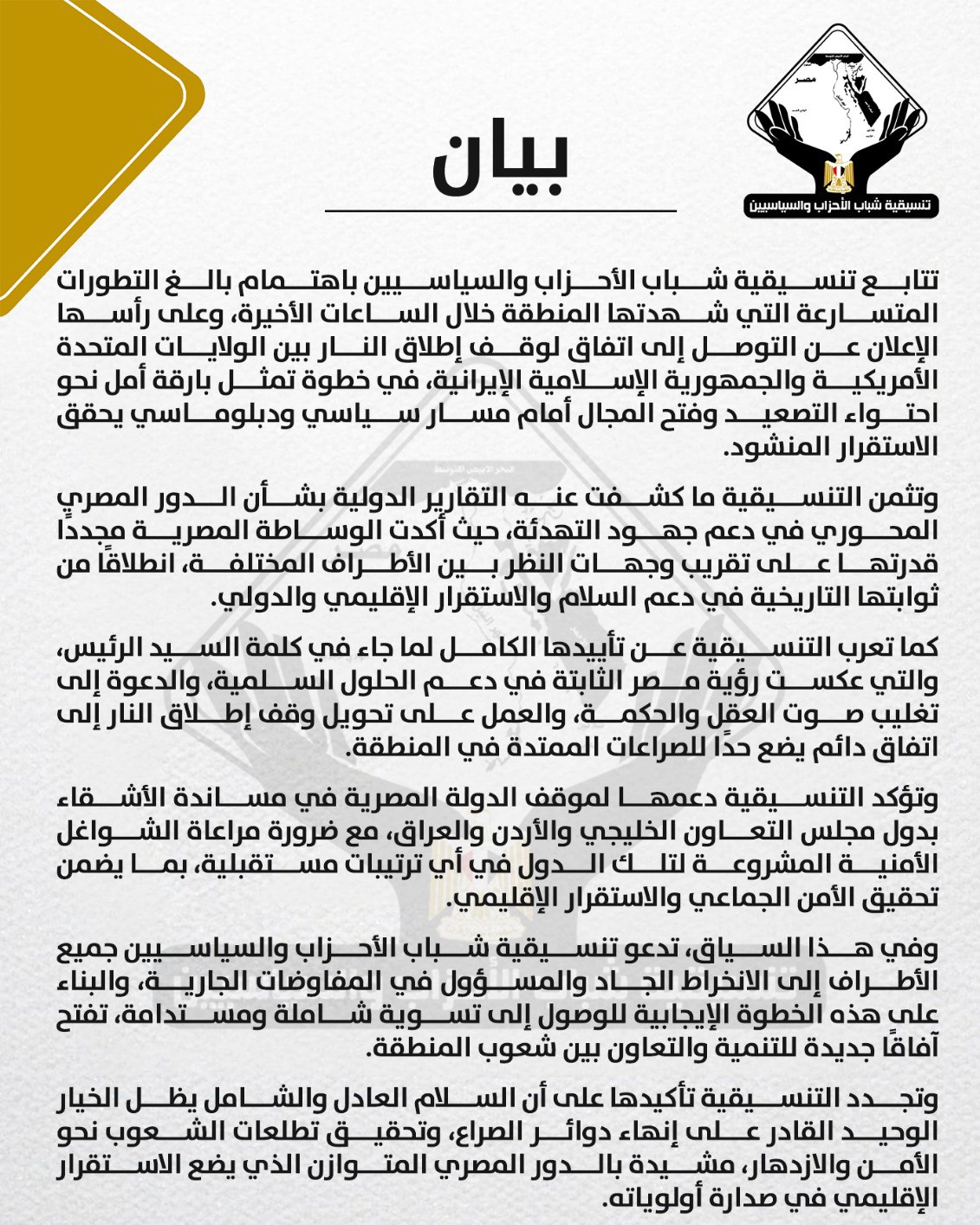 كما تعرب التنسيقية عن تأييدها الكامل لما جاء في كلمة السيد الرئيس، والتي عكست رؤية مصر الثابتة في دعم الحلول السلمية، والدعوة إلى تغليب صوت العقل والحكمة، والعمل على تحويل وقف إطلاق النار إلى اتفاق دائم يضع حدًا للصراعات الممتدة في المنطقة.