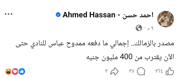 وكتب أحمد حسن: مصدر بالزمالك إجمالي ما دفعه ممدوح عباس للنادي حتى الآن يقترب من 400 مليون جنيه.