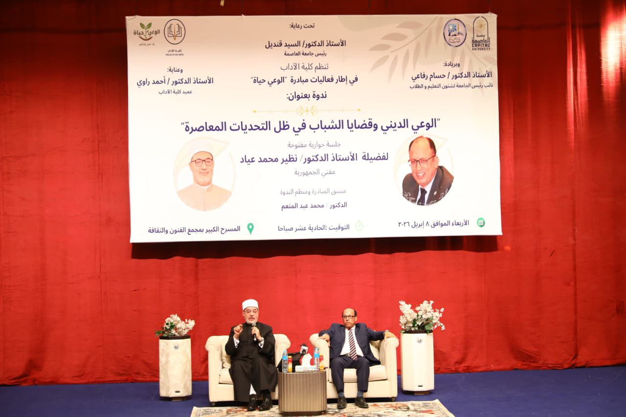 جاء ذلك خلال كلمة فضيلته في ندوة بعنوان "الوعي الديني وقضايا الشباب في ظل التحديات المعاصرة" ضمن فعاليات مبادرة "الوعي حياة" التي نظمتها كلية الآداب بجامعة العاصمة "حلوان سابقًا" بالتعاون مع المؤشر العالمي للفتوى بدار الإفتاء المصرية، بحضور الأستاذ الدكتور السيد قنديل رئيس الجامعة، والأستاذ الدكتور حسام رفاعي نائب رئيس الجامعة لشئون التعليم والطلاب، والأستاذ الدكتور وليد السروجي نائب رئيس الجامعة لشئون خدمة المجتمع وتنمية البيئة، إلى جانب عدد من عمداء الكليات ووكلائها وأعضاء هيئة التدريس والطلاب.