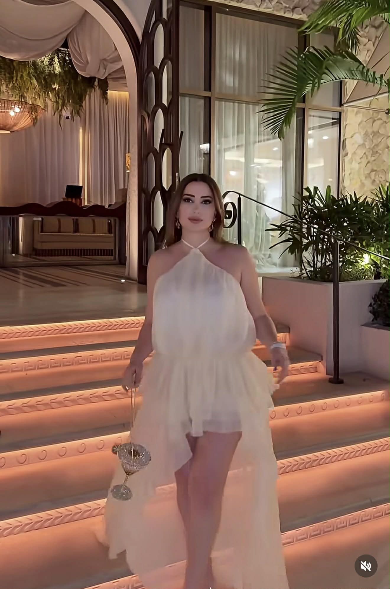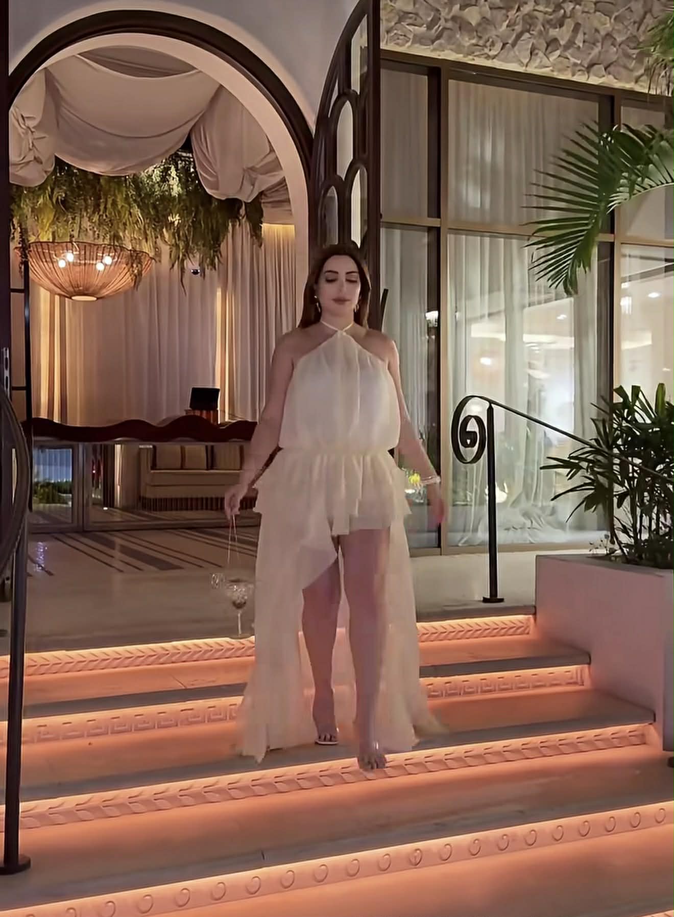 وظهرت نسرين طافش ، باطلالة ملفتة مرتدية فستانا باللون الاوف وايت اتسم بستايل القصير من الامام وطويل من الخلف.