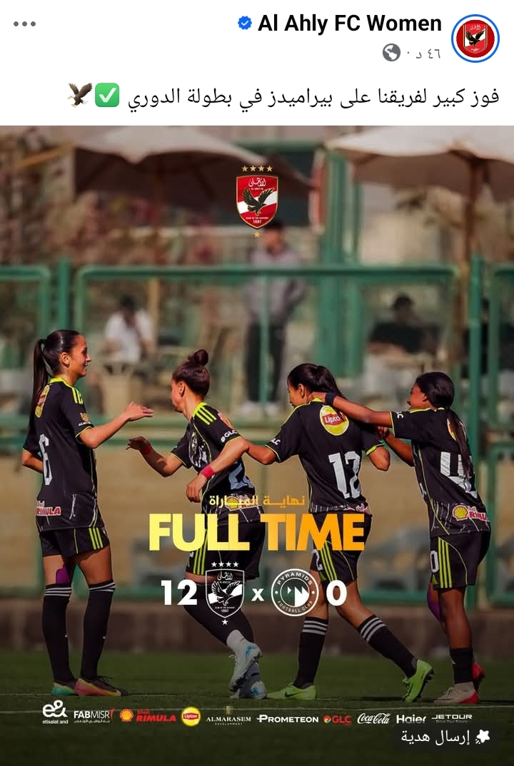 حقق الفريق الأول لكرة القدم «سيدات» بالنادي الأهلي فوزًا كبيرة على بيراميدز، بنتيجة 12 - 0، ضمن منافسات بطولة الدوري بالجولة 27، اليوم، على ملعب فرع الأهلي بالقاهرة الجديدة.
