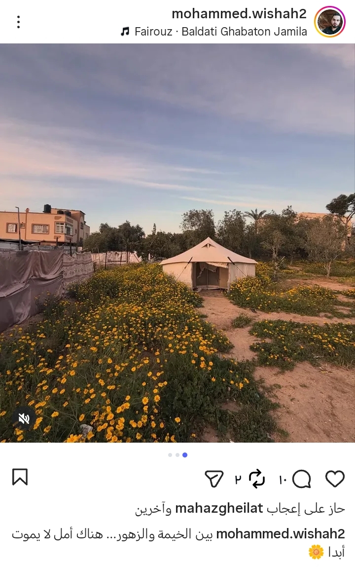 وقبل دقائق قليلة من استشهاده، كتب الصحفي محمد وشاح منشورًا عبر حسابه بمنصة انستجرام قال فيه: "بين الخيمة والزهور هناك أمل لا يموت أبدا".