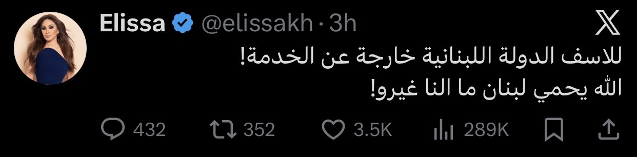 وقالت إليسا في تعليقها: “للأسف الدولة اللبنانية خارجة عن الخدمة! الله يحمي لبنان ما النا غيرو!”