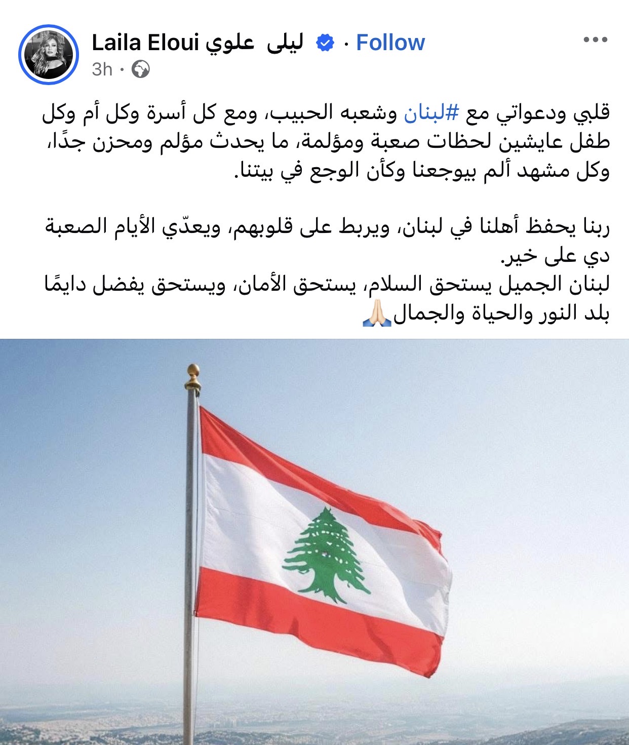 وعبّرت الفنانة ليلى علوي عن تضامنها مع الشعب اللبناني، بعد ضرب لبنان، من خلال رسالة مؤثرة نشرتها عبر حسابها الرسمي على موقع فيسبوك، وكتبت: