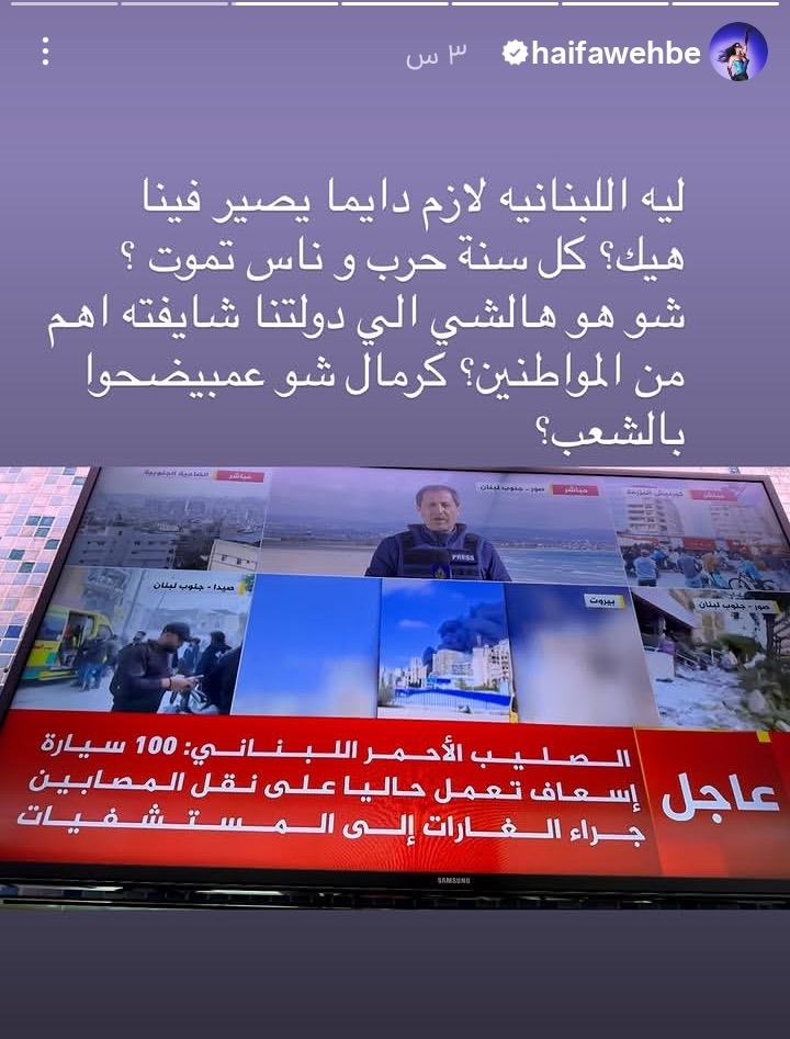 وعبّرت الفنانة هيفاء وهبي عن حزنها واستيائها من الأوضاع في لبنان، وذلك من خلال ستوري نشرتها عبر حسابها الرسمي على موقع إنستجرام، علّقت فيها على تداعيات الأحداث الأخيرة التي تشهدها البلاد، وكتبت:
