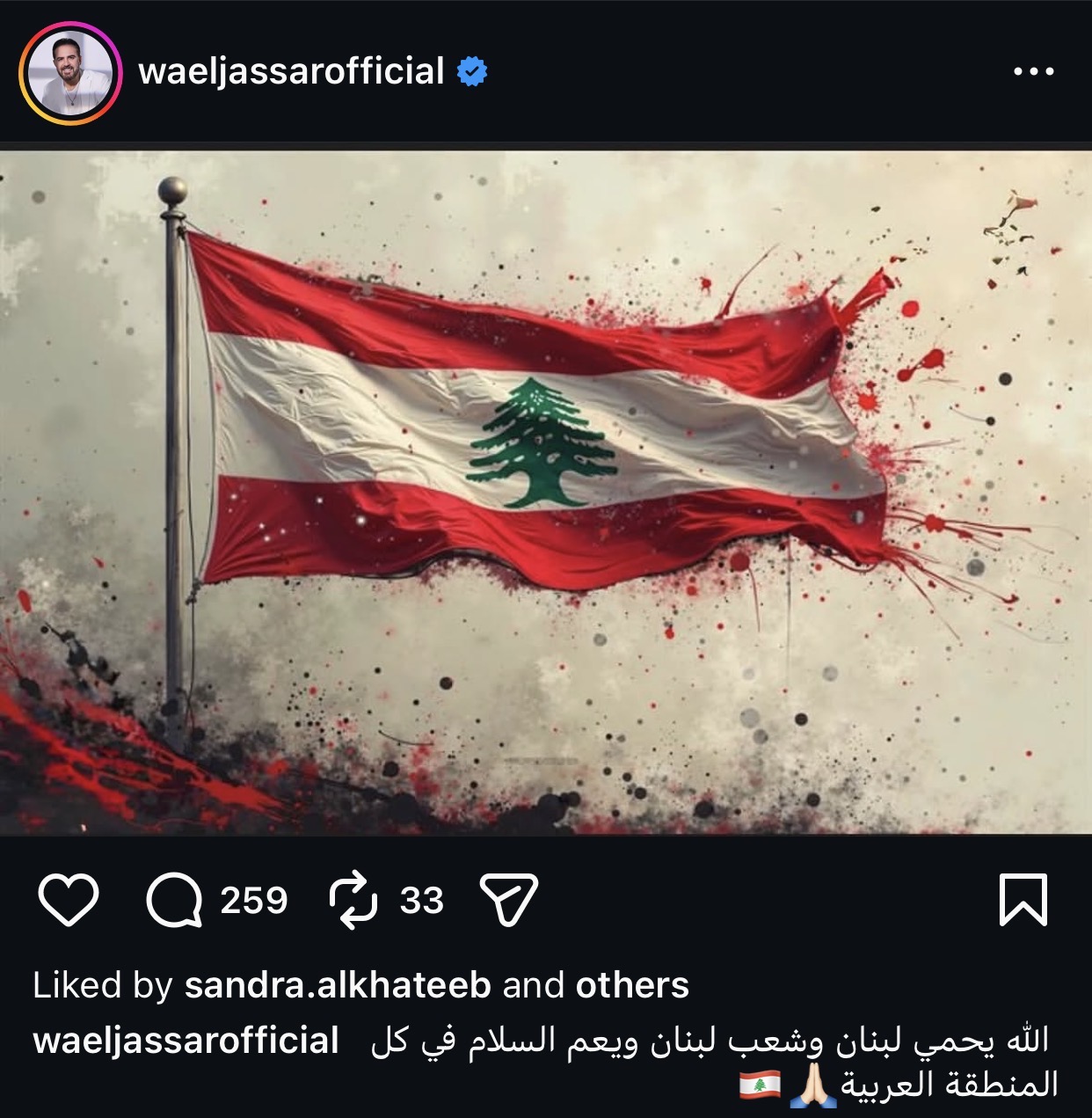 ونشر جسار عبر حسابه على إنستجرام رسالة مؤثرة قال فيها: “اللّٰه يحمي لبنان وشعب لبنان ويعم السلام في كل المنطقة العربية”، مؤكدًا دعمه الكامل للأمن والاستقرار في المنطقة".