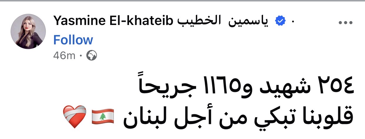 وكتبت ياسمين الخطيب معبرة عن حزنها الشديد على الأوضاع الحالية: “٢٥٤ شهيد و١١٦٥ جريح..قلوبنا تبكي من أجل لبنان”.