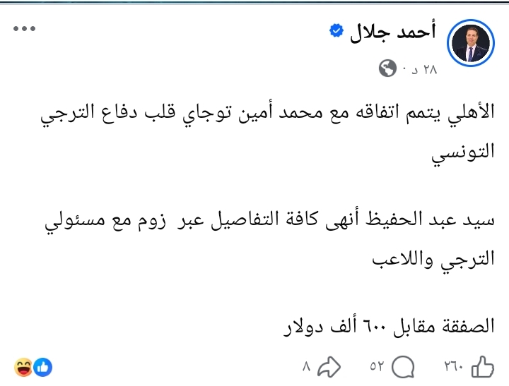وكتب جلال، عبر حسابه على “فيسبوك”: “الأهلي يتمم اتفاقه مع محمد أمين توجاي، قلب دفاع الترجي التونسي”.