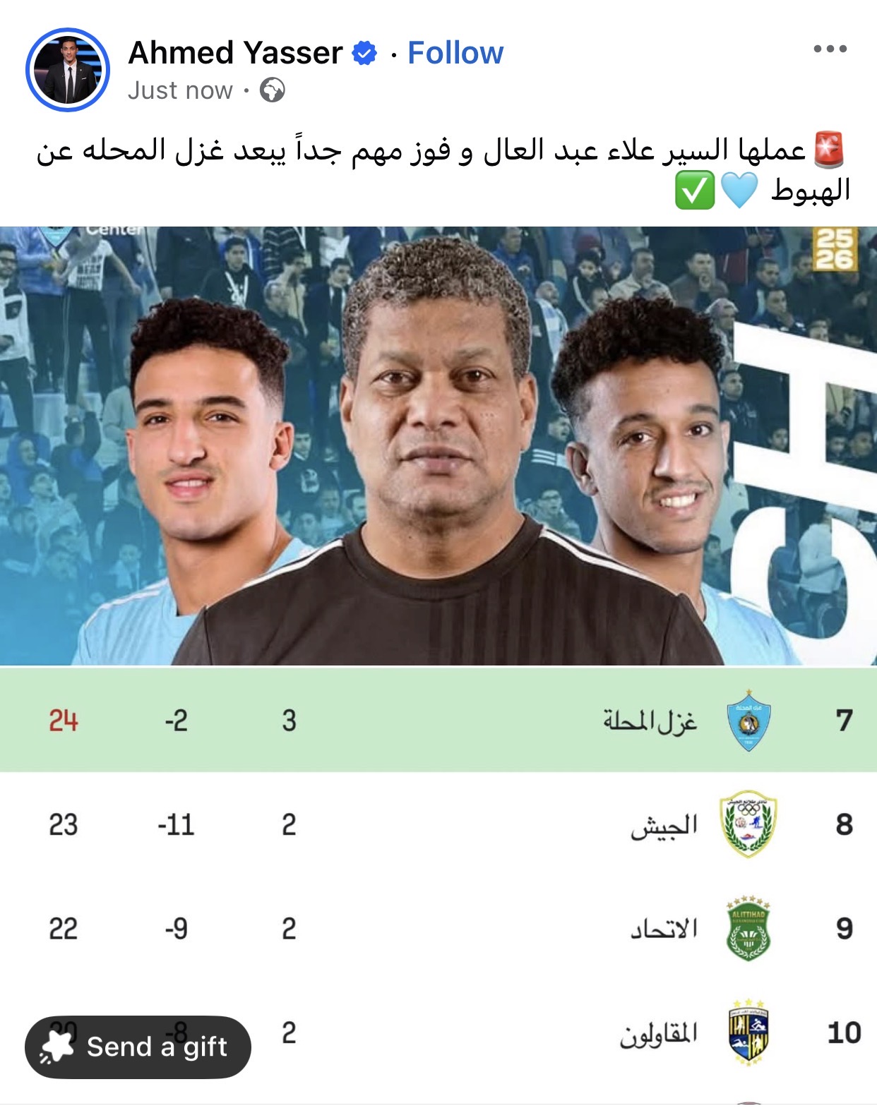 وكتب احمد ياسر عبر حسابه الشخصي بموقع فيسبوك: “عملها السير علاء عبدالعال وفوز مهم جدا يبعد غزل المحلة عن الهبوط”.