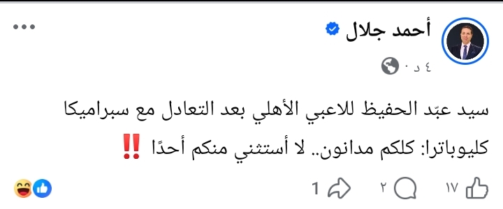 وكتب جلال عبر حسابه على فيسبوك: "سيد عبد الحفيظ للاعبي الأهلي بعد التعادل مع سيراميكا كليوباترا: كلكم مدانون.. لا أستثني منكم أحدًا".