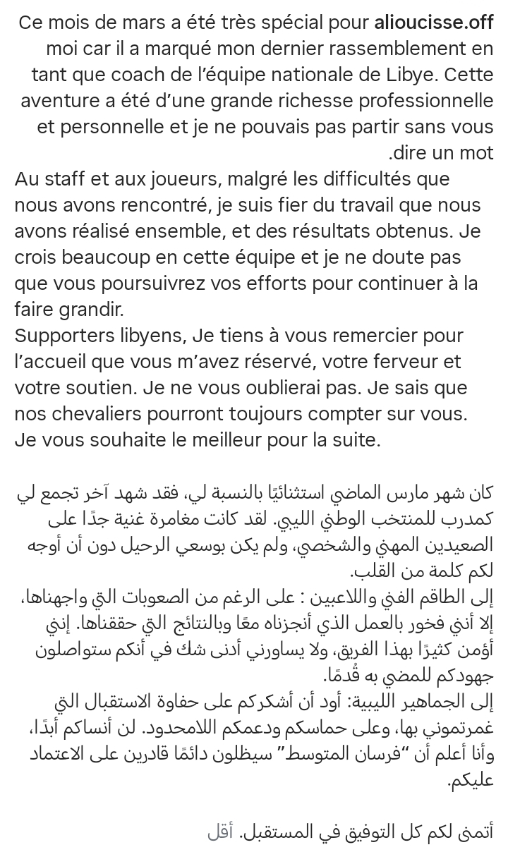 وكتب المدرب السنغالي عبر حسابه علي انستجرام: "كان شهر مارس الماضي استثنائيًا بالنسبة لي، فقد شهد آخر تجمع لي كمدرب للمنتخب الليبي".