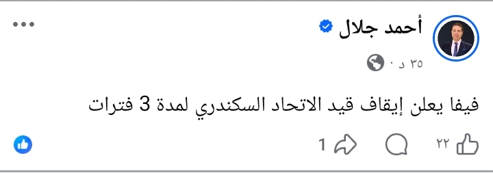 وكتب جلال عبر حسابه علي فيسبوك "فيفا يعلن إيقاف قيد الاتحاد السكندري لمدة 3 فترات".