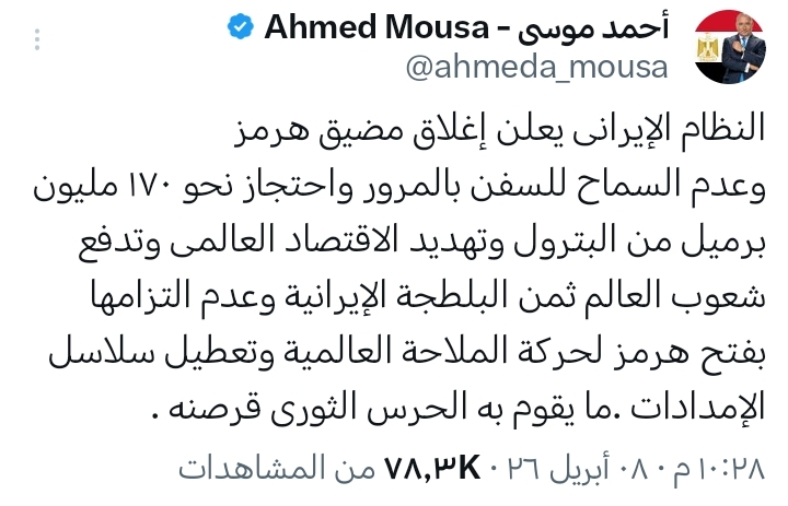 وكتب أحمد موسى، في تغريدة عبر حسابه على منصة "إكس":"النظام الإيراني يعلن إغلاق مضيق هرمز، وعدم السماح للسفن بالمرور، واحتجاز نحو 170 مليون برميل من البترول، ما يمثل تهديدًا للاقتصاد العالمي، ويجعل شعوب العالم تدفع ثمن البلطجة الإيرانية، وعدم التزامها بفتح هرمز لحركة الملاحة العالمية، وتعطيل سلاسل الإمدادات. ما يقوم به الحرس الثوري قرصنة."