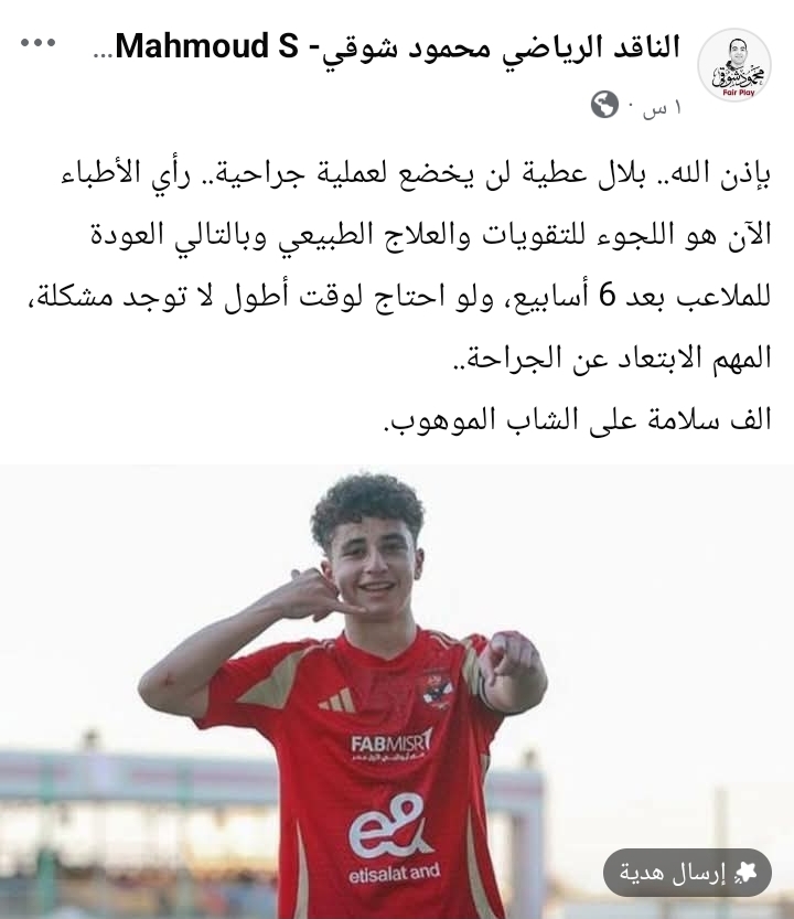 وكتب محمود شوقي عبر حسابه على فيسبوك: "بإذن الله، بلال عطية لن يخضع لعملية جراحية، حيث يرى الأطباء حاليًا الاكتفاء ببرنامج تقوية وعلاج طبيعي، على أن يعود للملاعب بعد 6 أسابيع.