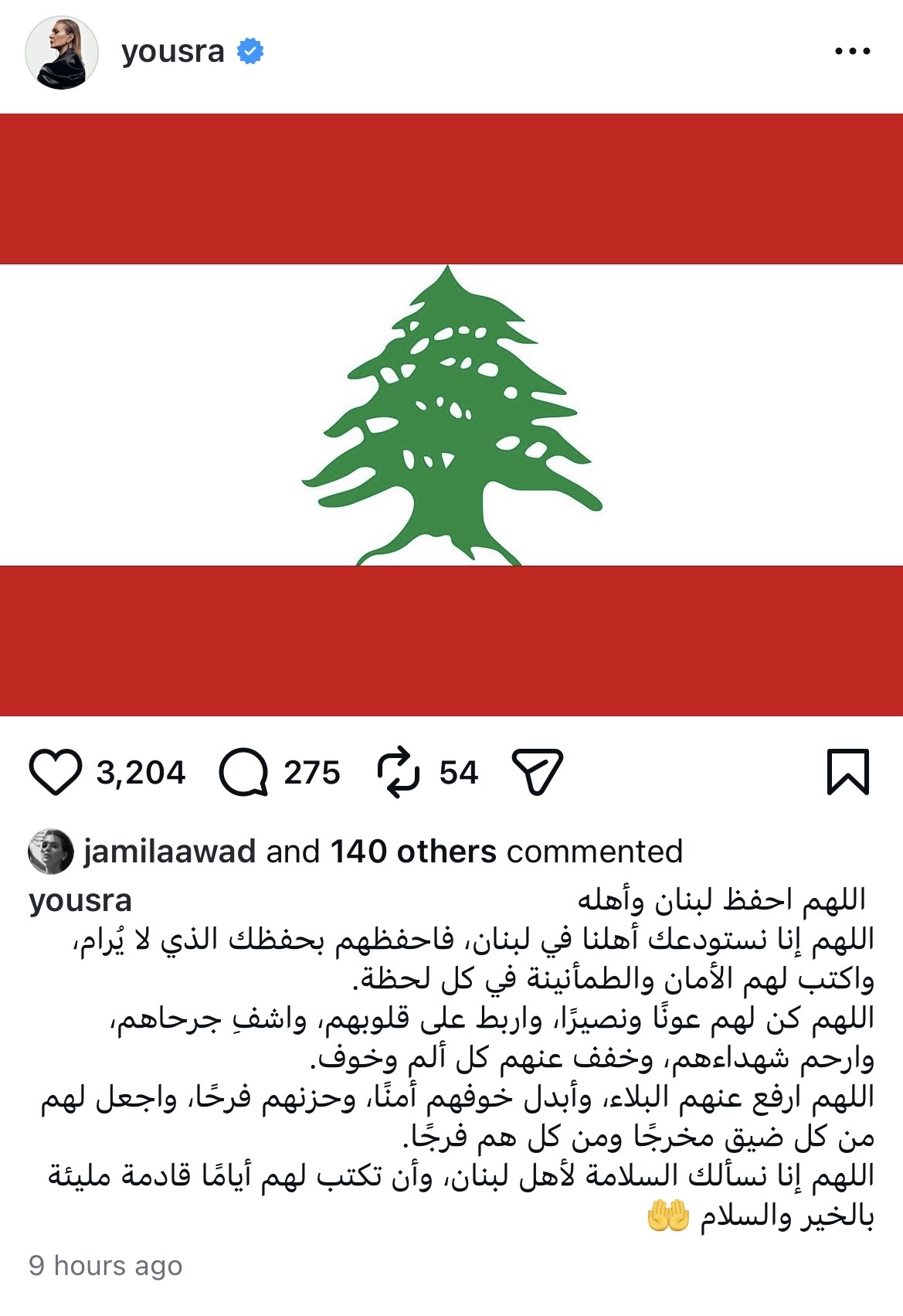 وكتبت يسرا عبر انستجرام: “اللهم احفظ لبنان وأهله اللهم إنا نستودعك أهلنا في لبنان، فاحفظهم بحفظك الذي لا يُرام، واكتب لهم الأمان والطمأنينة في كل لحظة. اللهم كن لهم عونًا ونصيرًا، واربط على قلوبهم، واشفِ جراحهم، وارحم شهداءهم، وخفف عنهم كل ألم وخوف. اللهم ارفع عنهم البلاء، وأبدل خوفهم أمنًا، وحزنهم فرحًا، واجعل لهم من كل ضيق مخرجًا ومن كل هم فرجًا. اللهم إنا نسألك السلامة لأهل لبنان، وأن تكتب لهم أيامًا قادمة مليئة بالخير والسلام ”.