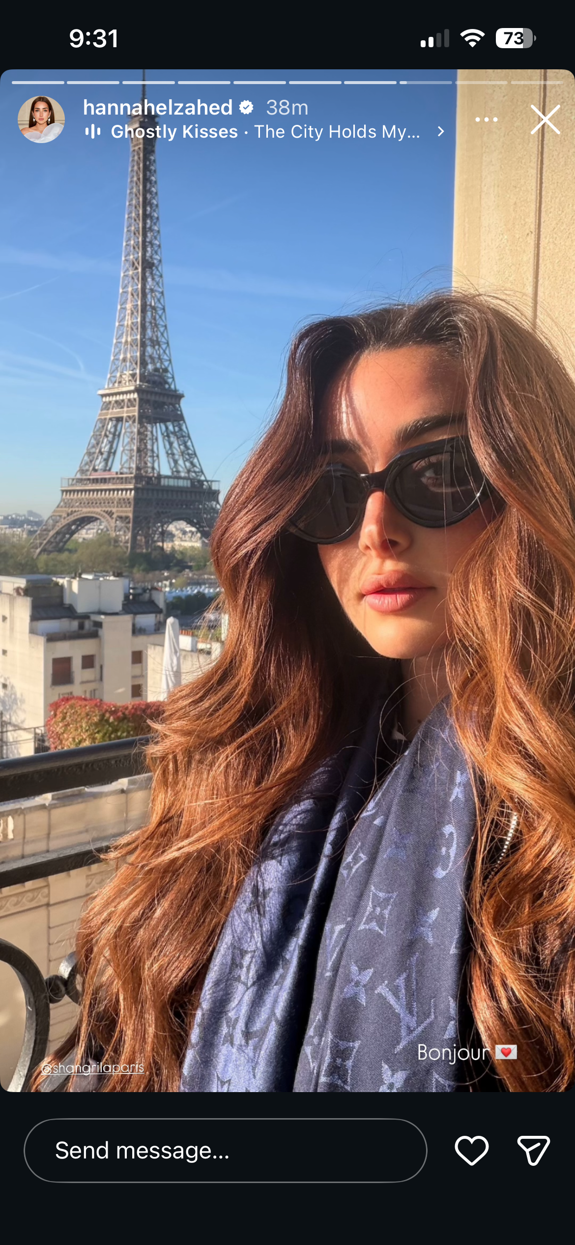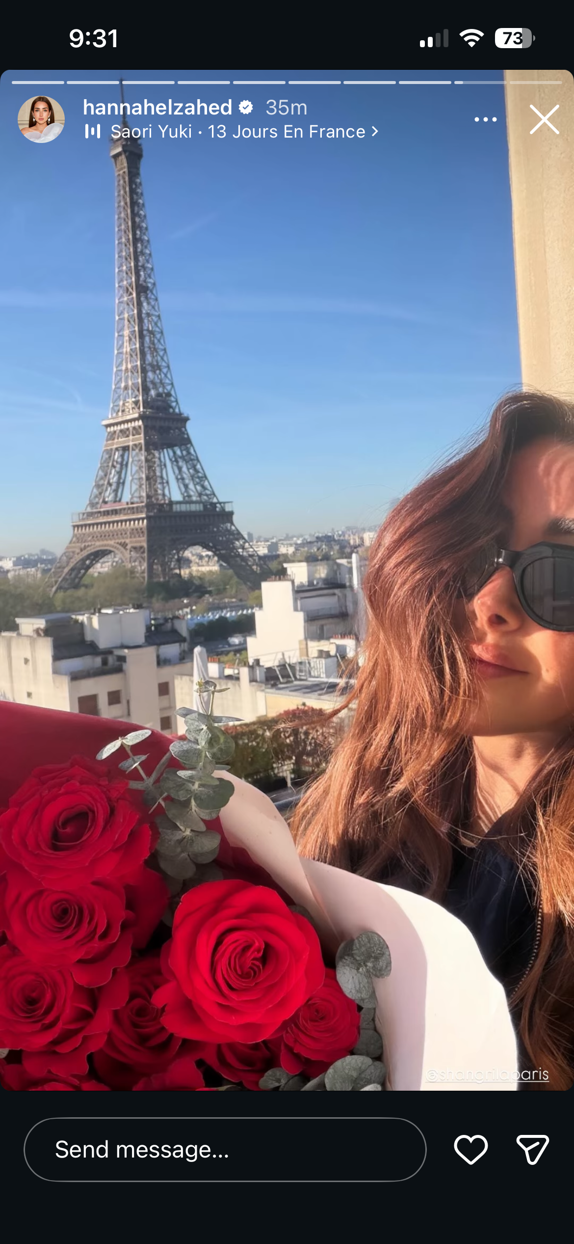 وتألقت هنا الزاهد من باريس أمام برج إيفل حاملة وردا أحمر، وبإطلالة كلاسيكية أنيقة.