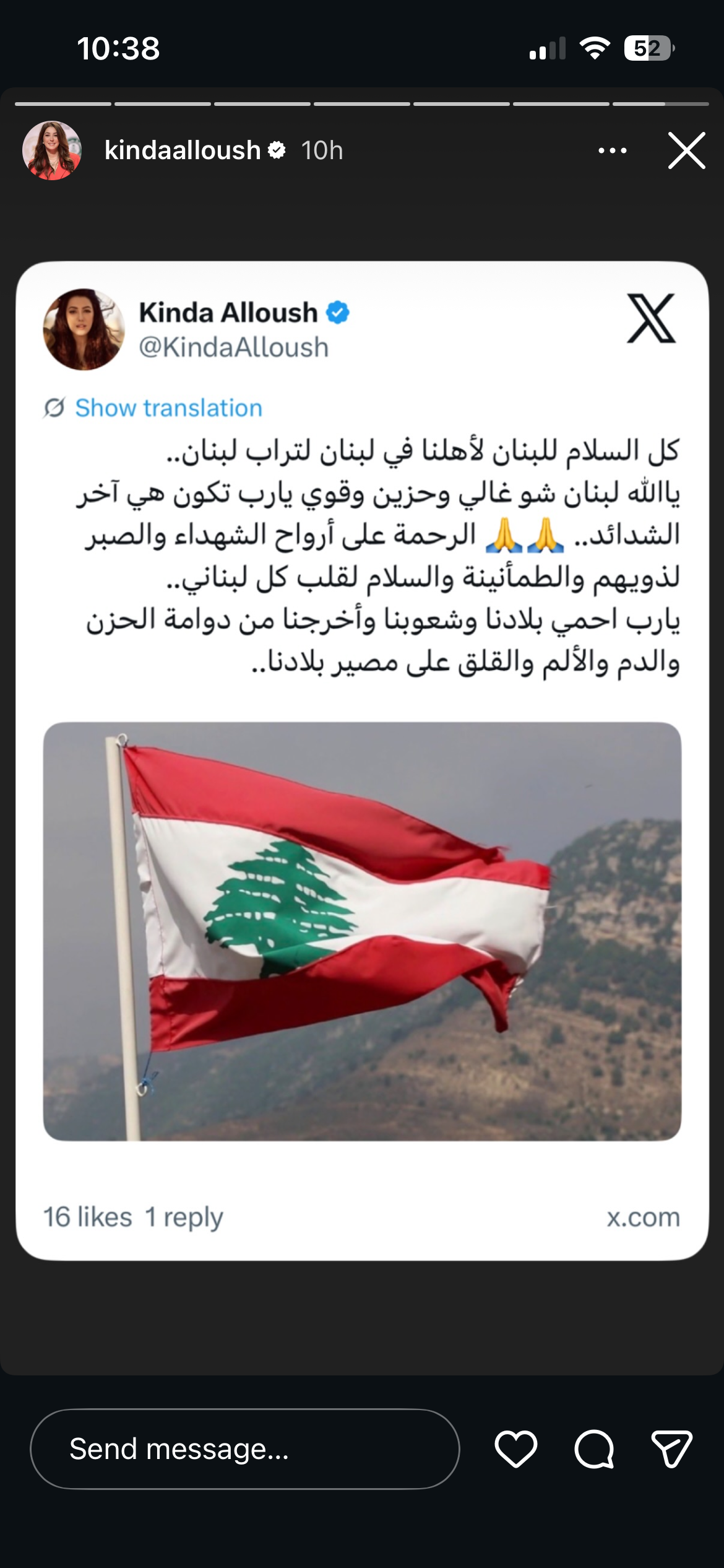 وكتبت كندة علوش عبر حسابها على إكس: "كل السلام للبنان لأهلنا في لبنان لتراب لبنان.. يا الله لبنان شو غالي وحزين وقوي يارب تكون هي آخر الشدائد.. الرحمة على أرواح الشهداء والصبر لذويهم والطمأنينة والسلام لقلب كل لبناني.. يارب احمي بلادنا وشعوبنا وأخرجنا من دوامة الحزن والدم والألم والقلق على مصير بلادنا".