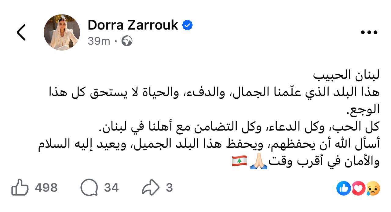 ونشرت درة عبر حساباتها على مواقع التواصل الاجتماعي رسالة مؤثرة قالت فيها:"لبنان الحبيب.. هذا البلد الذي علّمنا الجمال، والدفء، والحياة لا يستحق كل هذا الوجع.. كل الحب، وكل الدعاء، وكل التضامن مع أهلنا في لبنان.. أسأل الله أن يحفظهم، ويحفظ هذا البلد الجميل، ويعيد إليه السلام والأمان في أقرب وقت".