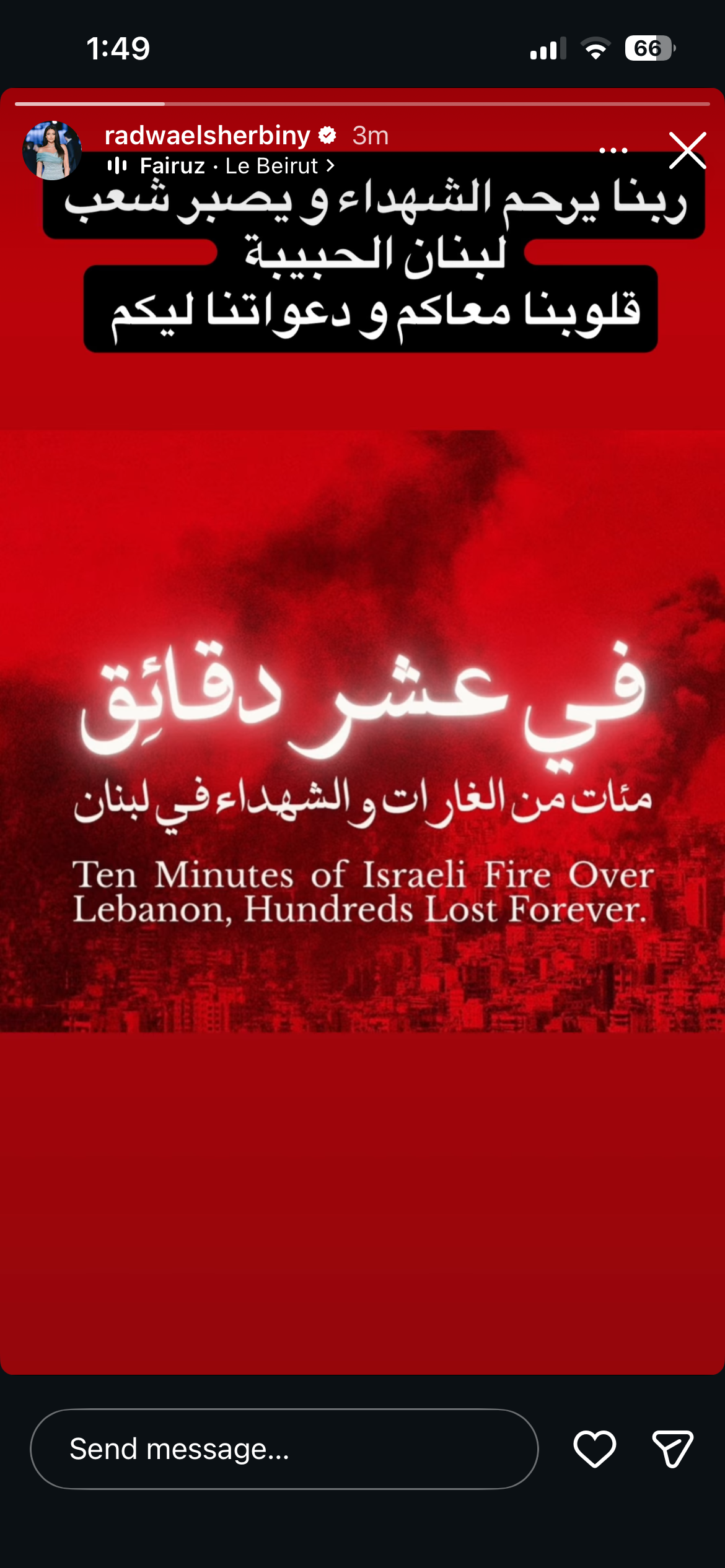 وكتبت رضوى الشربيني عبر حسابها على انستجرام: “ربنا يرحم الشهداء ويصبر شعب لبنان الحبيبة قلوبنا معكم ودعواتنا ليكم”.