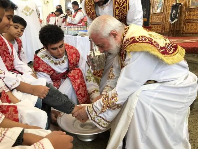 شارك في الصلوات القمص أنطون فؤاد، راعي الكاتدرائية، حيث بدأ اليوم بصلاة اللقان المقدس، ورتبة غسل الأرجل، ثم ترأس الأب المطران صلاة القداس الإلهي، حيث ألقى صاحب النيافة عظة الذبيحة الإلهية بعنوان "الفرق بين العهد والمعاهدة".