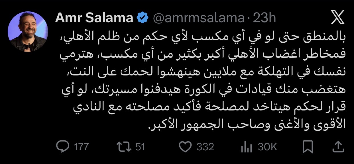 وكتب سلامة عبر حسابه على منصة “إكس”: “بالمنطق حتى لو في أي مكسب لأي حكم من ظلم الأهلي، فمخاطر اغضاب الأهلي أكبر بكثير من أي مكسب”.