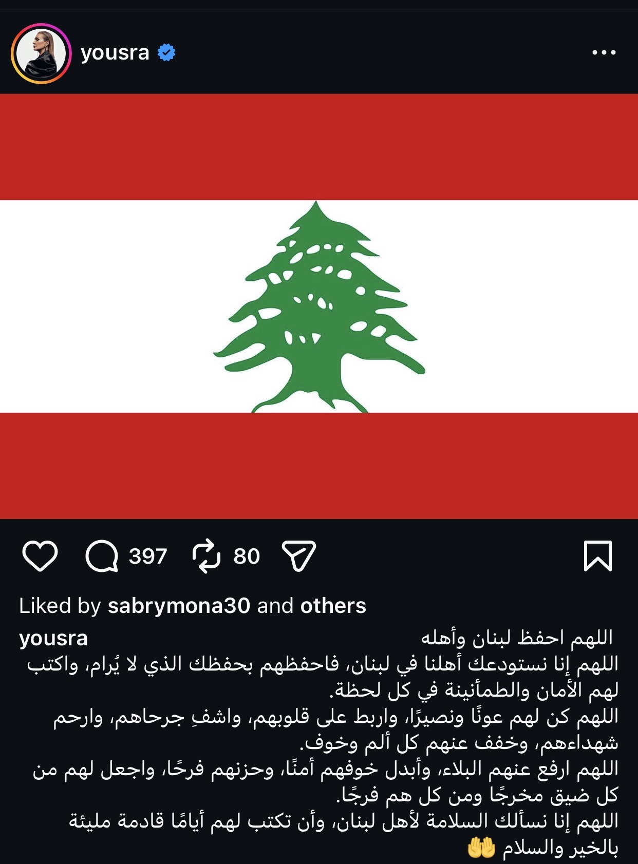 ونشرت يسرا عبر حسابها على موقع التواصل الاجتماعي انستجرام دعاءً مؤثرًا، قالت فيه: "اللهم احفظ لبنان وأهله، اللهم إنا نستودعك أهلنا في لبنان، فاحفظهم بحفظك الذي لا يُرام، واكتب لهم الأمان والطمأنينة في كل لحظة".