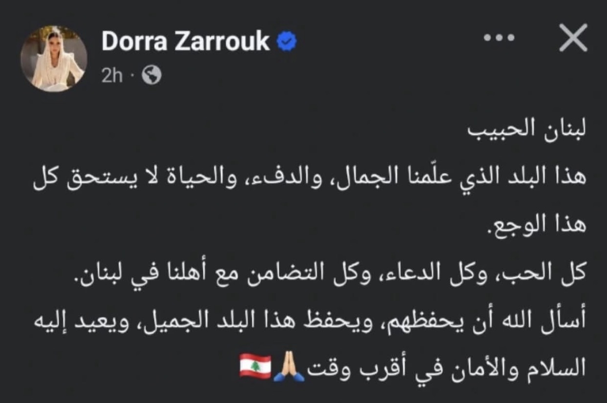 ونشرت درة عبر حسابها الرسمي، كلمات عبرت خلالها عن حبها الكبير للبنان، قائلة: "لبنان الحبيب، هذا البلد الذي علّمنا الجمال، والدفء، والحياة لا يستحق كل هذا الوجع، كل الحب، وكل الدعاء، وكل التضامن مع أهلنا في لبنان.