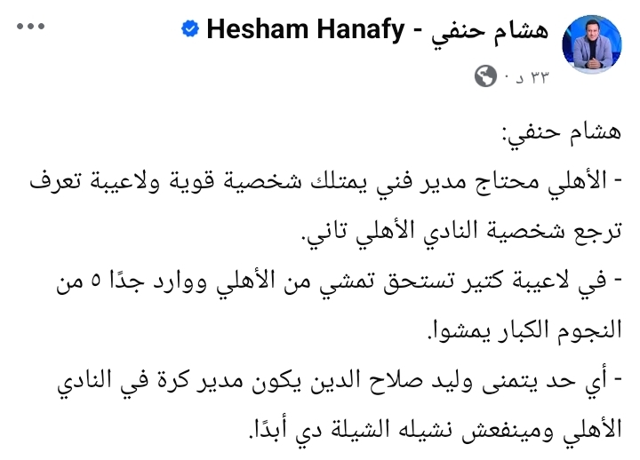 وأكد حنفي عبر حسابه علي فيسبوك" أن الأهلي في حاجة إلى مدير فني يمتلك شخصية قوية، إلى جانب لاعبين قادرين على استعادة هيبة وشخصية الفريق داخل الملعب، مشددًا على ضرورة إجراء تغييرات حاسمة.