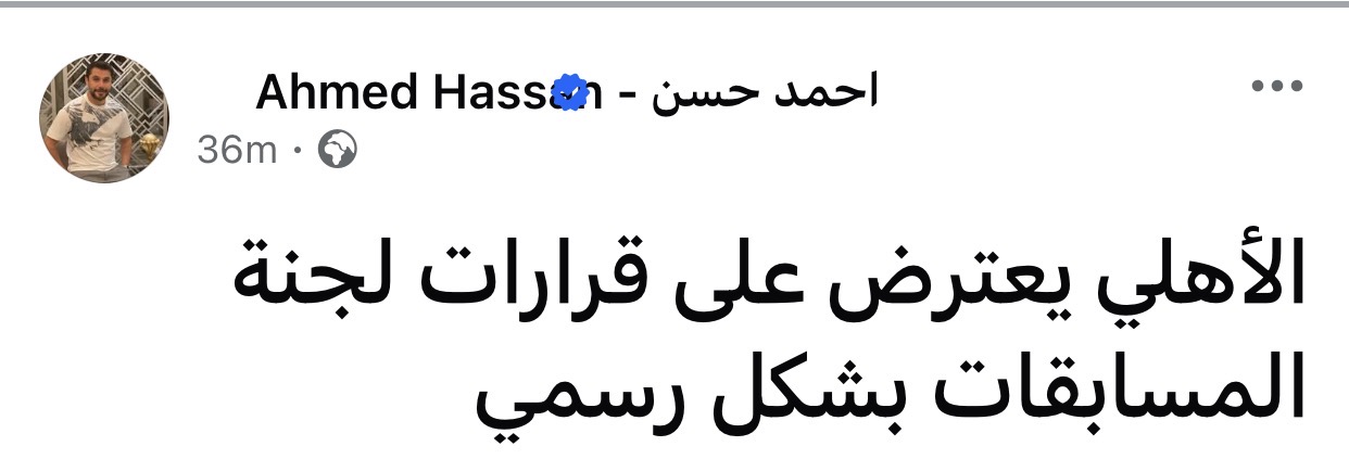 تقدم النادي الأهلي باعتراض رسمي على القرارات الصادرة عن لجنة المسابقات، وذلك وفق ما أعلنه أحمد حسن عبر حسابه الشخصي على موقع التواصل الاجتماعي فيسبوك.