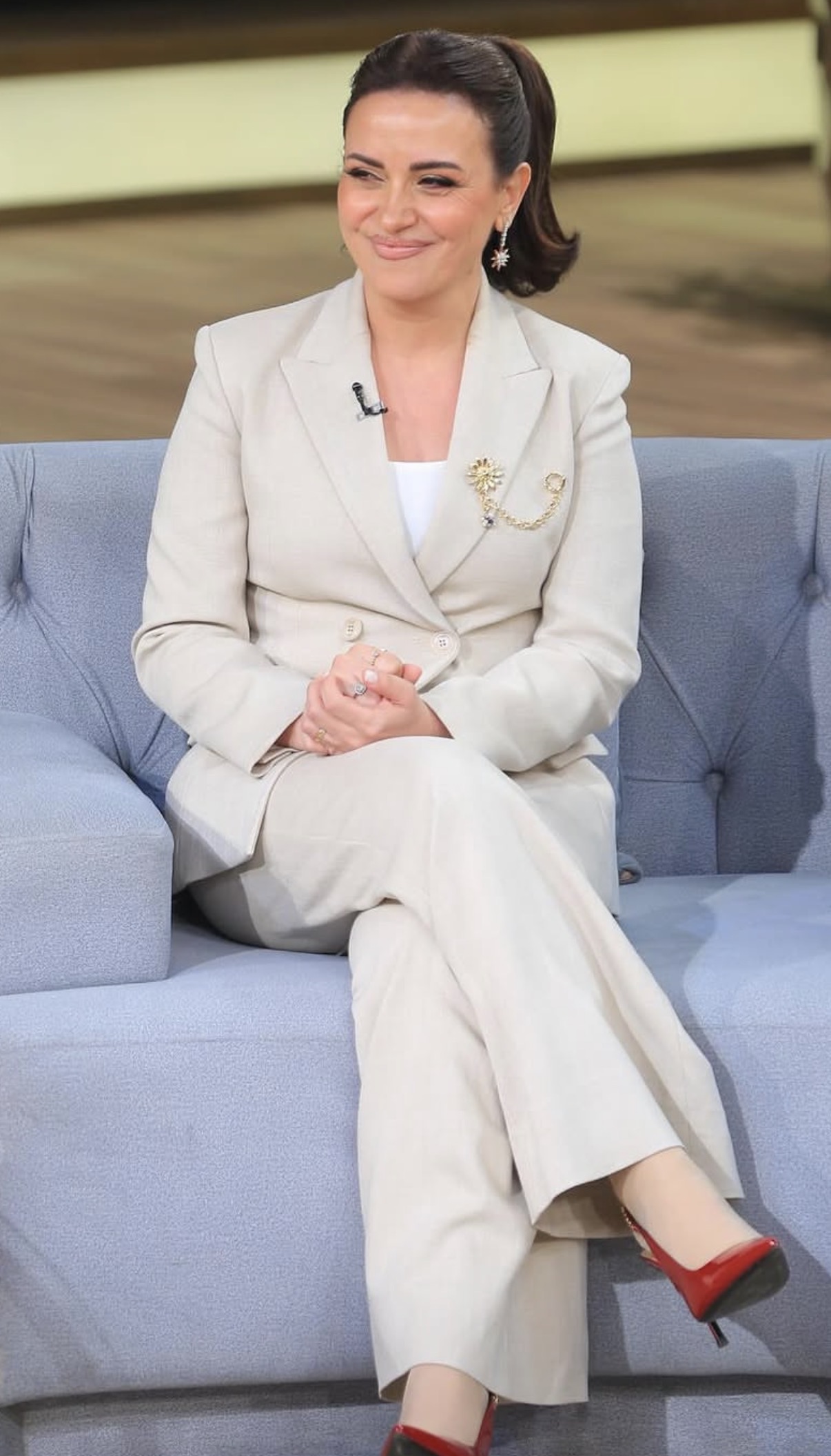 تألقت ريهام عبد الغفور في الصور بإطلالة كلاسيك، حيث ارتدت بليزر باللون البيج الفاتح مع بنطلون بنفس اللون الذي لا يحمل أي نقوشات أو تطريزات.