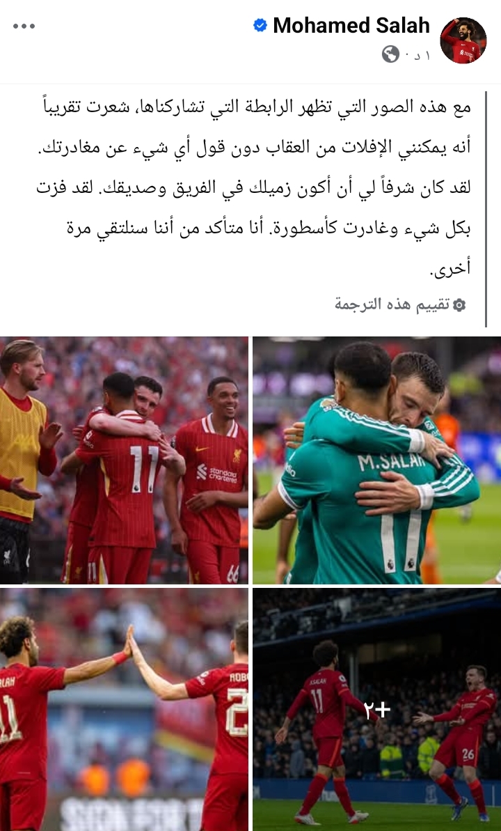 حرص النجم محمد صلاح لاعب نادي ليفربول، على توجيه رسالة إلى أندرو روبرتسون، وذلك بعد إعلان رحيله عن ليفربول بصورة رسمية.