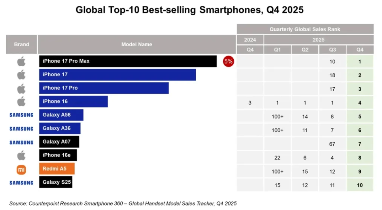 تصدر هاتف iPhone 17 Pro Max القائمة، بعدما استحوذ بمفرده على نحو 5% من إجمالي مبيعات الهواتف الذكية عالميا.