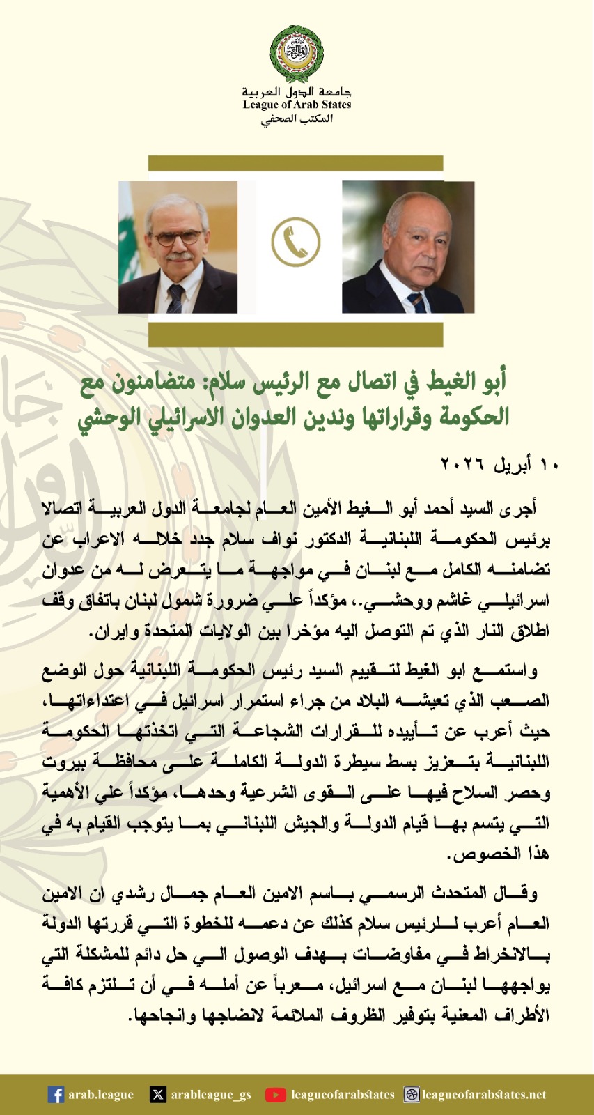 واستمع أبو الغيط لتقييم رئيس الحكومة اللبنانية حول الوضع الصعب الذي تعيشه البلاد من جراء استمرار إسرائيل في اعتداءاتها، حيث أعرب عن تأييده للقرارات الشجاعة التي اتخذتها الحكومة اللبنانية بتعزيز بسط سيطرة الدولة الكاملة على محافظة بيروت وحصر السلاح فيها على القوى الشرعية وحدها، مؤكداً على الأهمية التي يتسم بها قيام الدولة والجيش اللبناني بما يتوجب القيام به في هذا الخصوص.