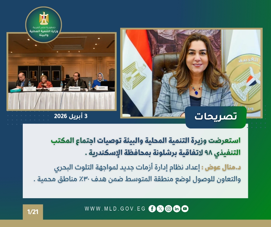 استعرضت الدكتورة منال عوض وزيرة التنمية المحلية والبيئة، توصيات اجتماع المكتب التنفيذي ٩٨ لاتفاقية حماية البيئة البحرية والمنطقة الساحلية للبحر الأبيض المتوسط (إتفاقية برشلونة) بمدينة الإسكندرية التاريخية والذي عُقد يومي 31 مارس و 1 أبريل الجاري، حيث تضمنت التوصيات التوجيه بالبدء في إعداد نظام المعايير الرئيسية 2028- 2033 لتقييم نظام إدارة الأزمات الحالي وإعداد نظام إدارة الأزمات الجديد خاصة فيما يتعلق بمواجهة التلوث البحري، والعمل على تحقيق هدف الوصول للمناطق المحمية إلي 30% من مساحة منطقة المتوسط خاصة المناطق البحرية المحمية ذات الأهمية البيئية بحلول عام 2030.