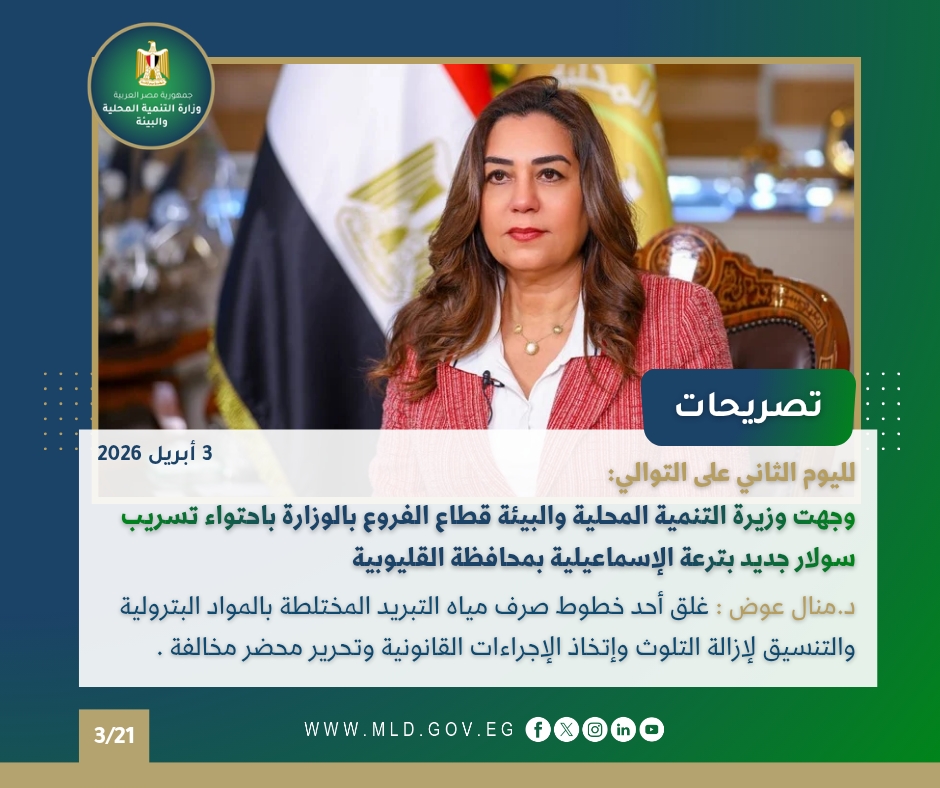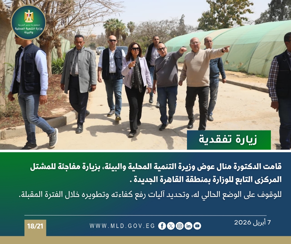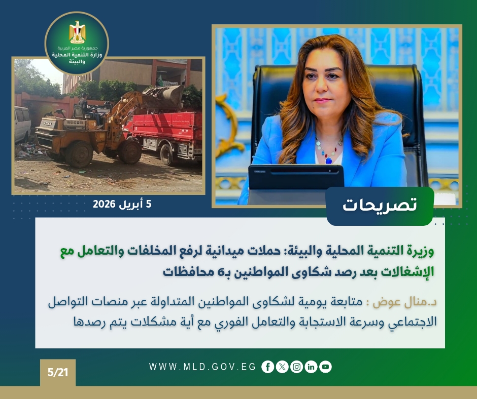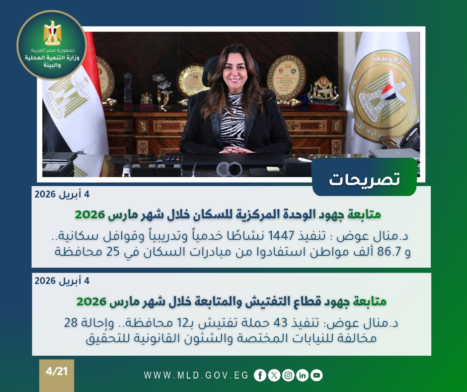 كما أعلنت الدكتورة منال عوض وزيرة التنمية المحلية والبيئة، عن نتائج جهود قطاع تقويم الأداء والمتابعة والتفتيش خلال شهر مارس 2026، حيث تم تنفيذ 43 حملة تفتيش متنوعة ما بين حملات مخططة ومفاجئة وفحص شكاوى لعدد من المواطنين، شملت 12 محافظة، هي: القاهرة، الجيزة، القليوبية، سوهاج، المنيا، الفيوم، أسيوط، المنوفية، الغربية، بني سويف، دمياط، والدقهلية، وقد أسفرت تلك الحملات عن إحالة 28 حالة للنيابات المختصة والشئون القانونية، من بينها حالة للنيابة العامة وحالتان للنيابة الإدارية، وذلك في إطار اتخاذ الإجراءات القانونية الرادعة تجاه المخالفات.