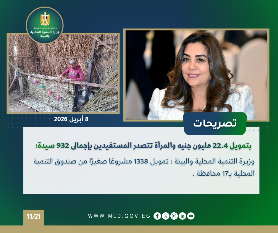 وتلقت الدكتورة منال عوض، وزيرة التنمية المحلية والبيئة، تقريراً حول جهود صندوق التنمية المحلية بالوزارة في تمويل المشروعات وتوفير فرص عمل مستدامة بالمحافظات، حيث نجح الصندوق خلال الفترة من يوليو 2025 وحتى مارس 2026، في تمويل عدد 1338 مشروعًا صغيرًا ومتناهي الصغر بـ17 محافظة، وذلك بإجمالي قروض بلغ نحو 22,464,000 جنيه، في حين بلغت مساهمة المستفيدين نحو 4,492,800 جنيه، بإجمالي استثمارات وصلت إلى 26,928,000 جنيه، وهو ما يعكس تكامل مصادر التمويل وتعظيم الاستفادة منها.