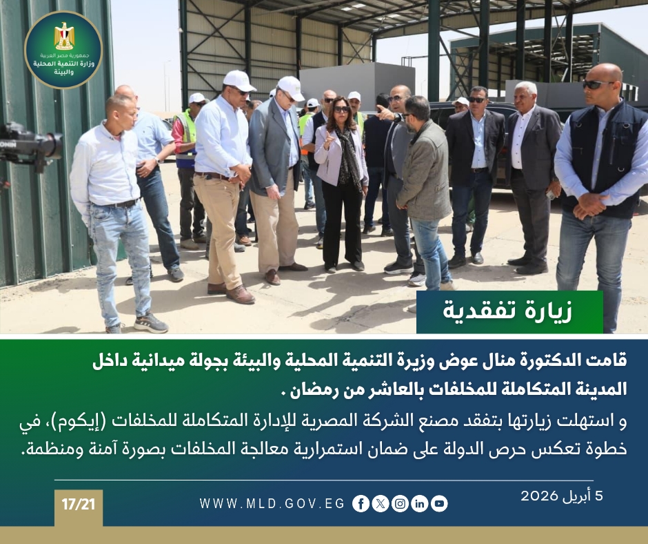كما قامت الدكتورة منال عوض وزيرة التنمية المحلية والبيئة، بجولة ميدانية داخل المدينة المتكاملة للمخلفات بالعاشر من رمضان، واستهلت زيارتها بتفقد مصنع الشركة المصرية للإدارة المتكاملة للمخلفات (إيكوم)، في خطوة تعكس حرص الدولة على ضمان استمرارية معالجة المخلفات بصورة آمنة ومنظمة بالتزامن مع غلق مقلب العبور.