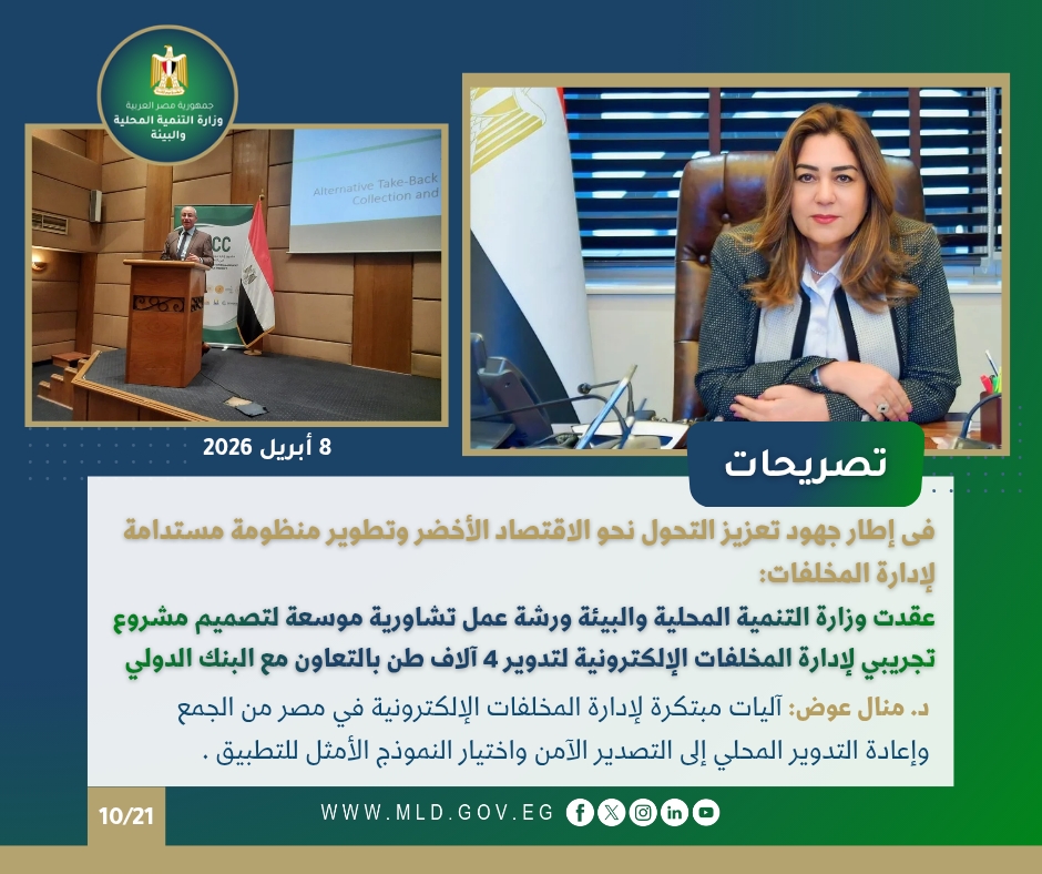 في إطار توجيهات الدكتورة منال عوض، وزيرة التنمية المحلية والبيئة، بمواصلة جهود تعزيز التحول نحو الاقتصاد الأخضر وتطوير منظومة مستدامة لإدارة المخلفات، عقدت وزارة التنمية المحلية والبيئة، من خلال جهاز تنظيم إدارة المخلفات، وبالتعاون مع مشروع "إدارة تلوث الهواء وتغير المناخ في القاهرة الكبرى"، ورشة عمل تشاورية موسعة بالمركز الثقافى التعليمى البيئي "بيت القاهرة" بالفسطاط ، لمناقشة تصميم مشروع تجريبي يستهدف جمع وإعادة تدوير نحو 4000 طن من المخلفات الإلكتروني.