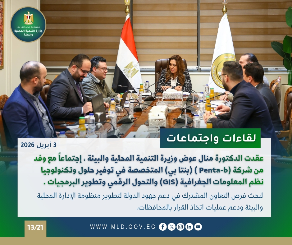 وعقدت الدكتورة منال عوض وزيرة التنمية المحلية والبيئة ، إجتماعاً مع وفد من شركة Penta-b ) بنتا بي) المتخصصة في توفير حلول وتكنولوجيا نظم المعلومات الجغرافية GIS) ) والتحول الرقمي وتطوير البرمجيات، لبحث فرص التعاون المشترك في دعم جهود الدولة لتطوير منظومة الإدارة المحلية والبيئة ودعم عمليات اتخاذ القرار بالمحافظات.