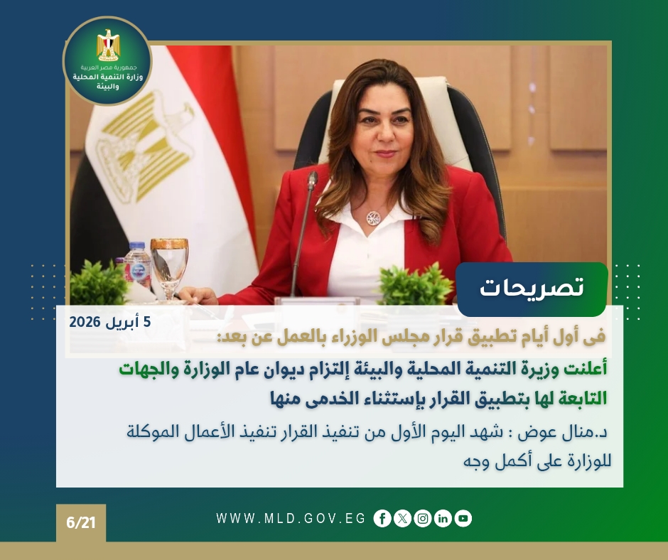 وأعلنت الدكتورة منال عوض وزيرة التنمية المحلية والبيئة، إلتزام ديوان عام الوزارة وجهازى شئون البيئة وتنظيم إدارة المخلفات التابعين لها بتطبيق قرار رئيس مجلس الوزراء فيما يتعلق بالعمل عن بُعد يوم الأحد من كل أسبوع لمدة شهر، وذلك بالنسبة لكافة العاملين والأجهزة والجهات التابعة للوزارة الذين تتلاءم طبيعة ما يقومون به من أعمال مع هذا النظام مع إستثناء القطاعات الخدمية التى ترتبط بمصالح المواطنين بشكل مباشر وقطاعات التفتيش والمتابعة الميدانية.